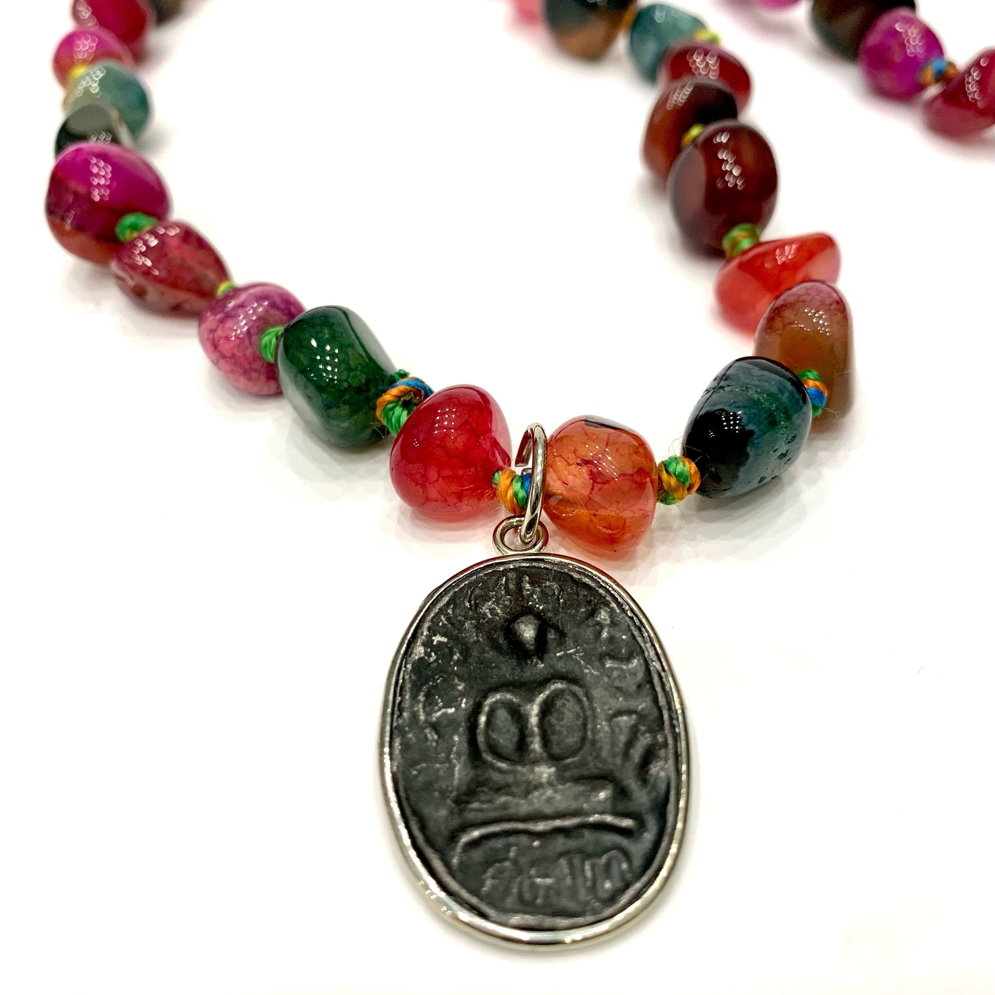 ARYA MULTICOLOR PIETRA ~ 7 CHAKRA ~BRACCIALE IN PIETRE DURE NATURALI e nodini ACCIAIO con ciondolo BUDDHA miniatura