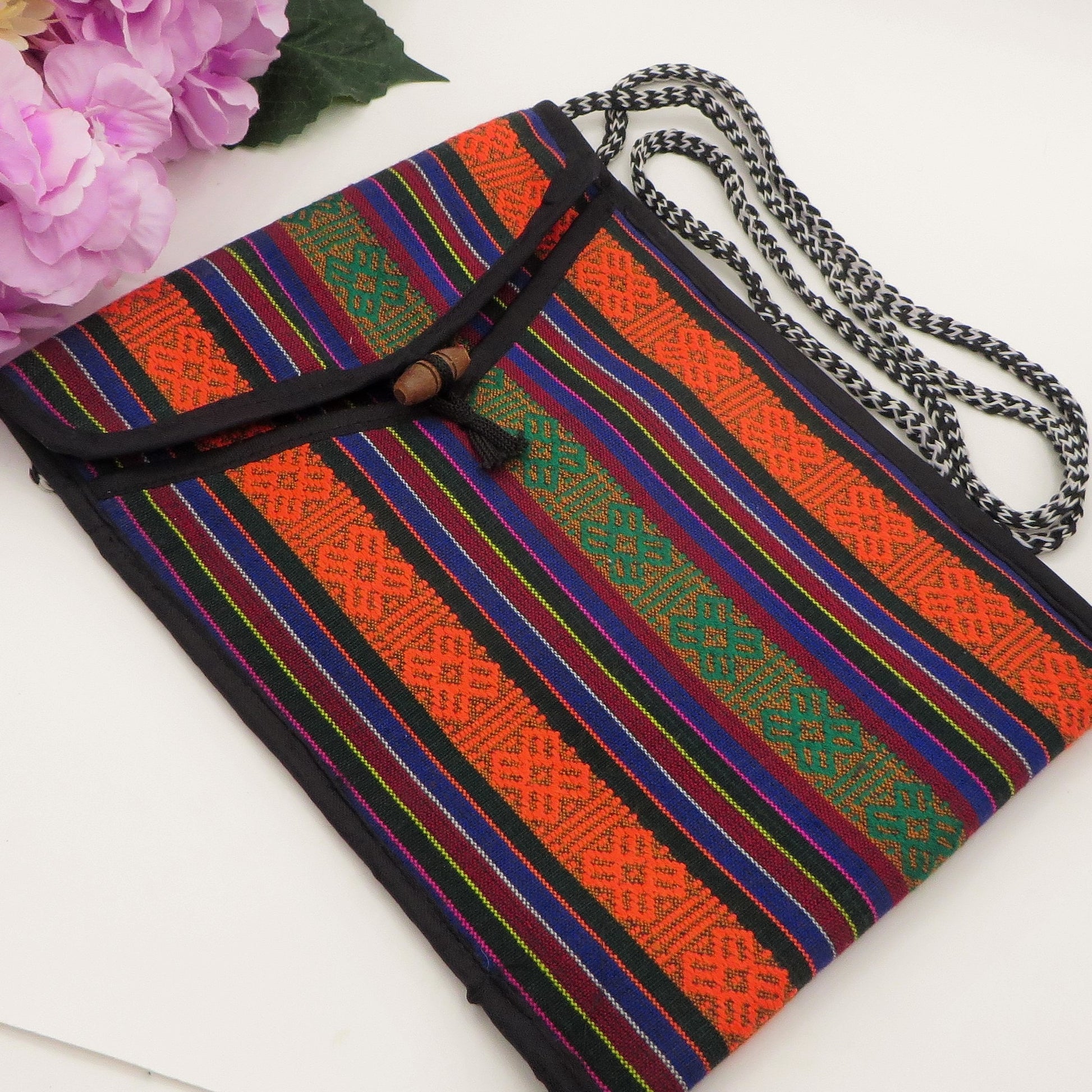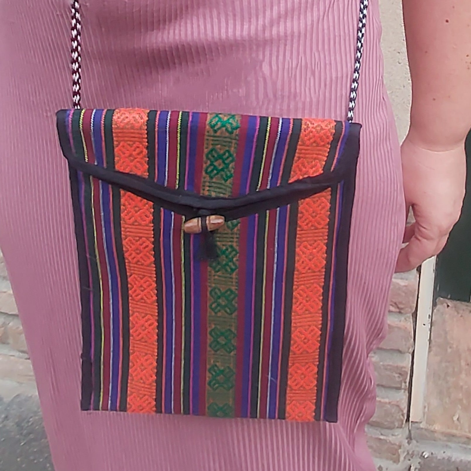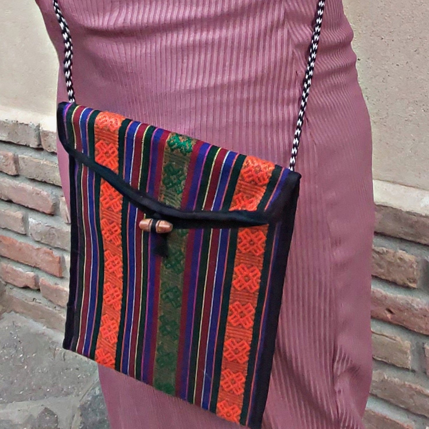 Bellissima tracollina in tessuto millerighe multicolor Tibetano Vintage, la fantasia tipica che contraddistingue questo popolo, gentile e compassionevole.