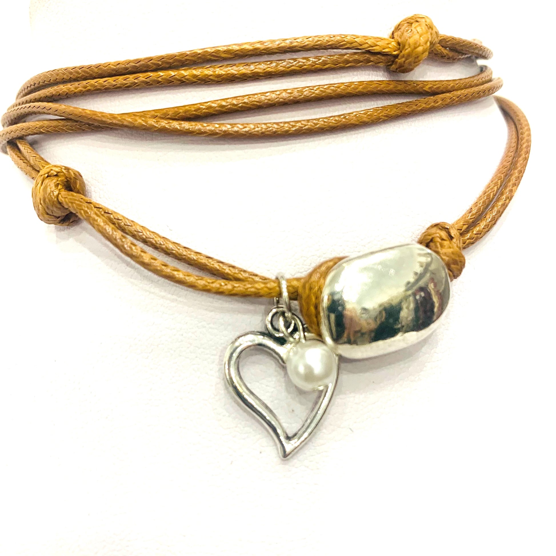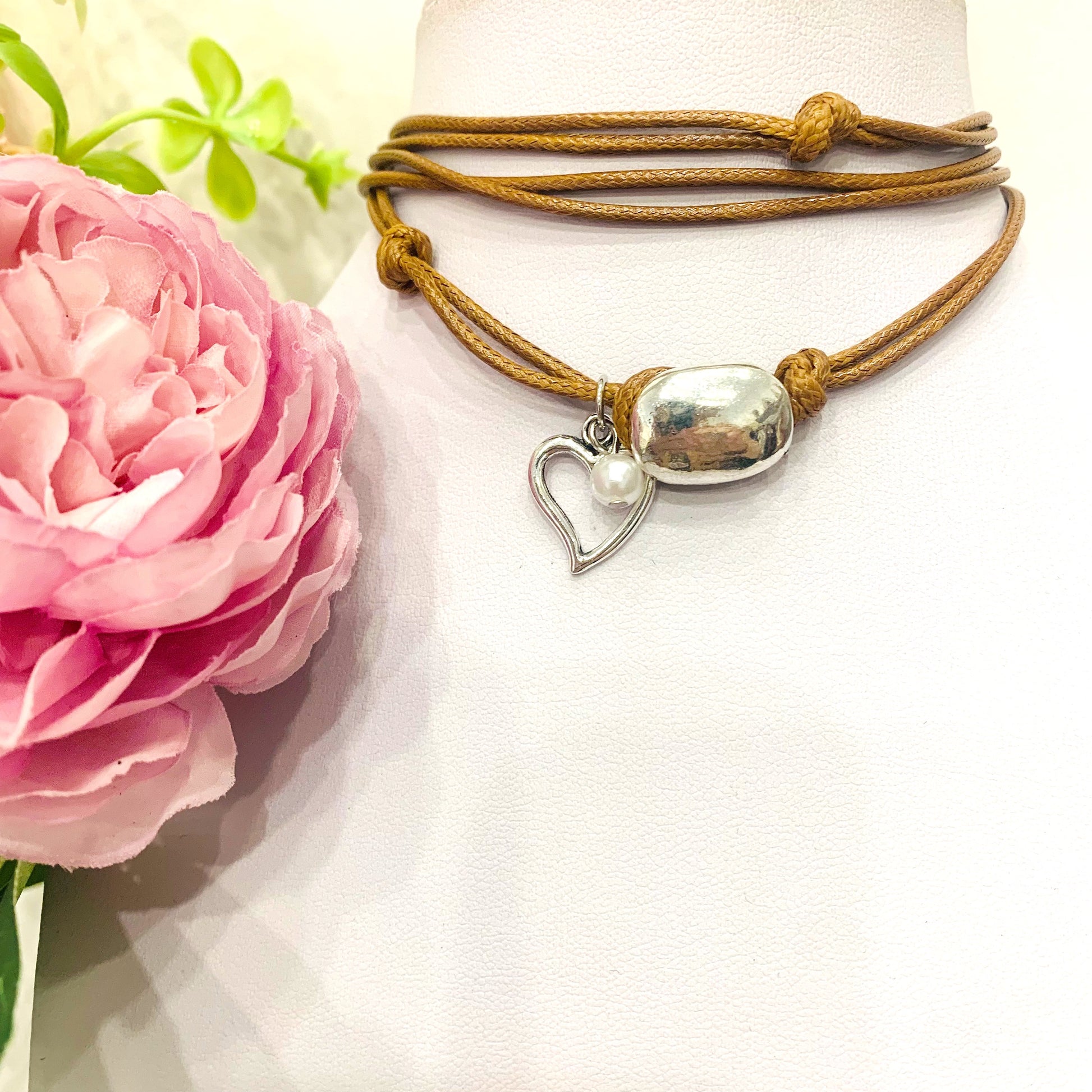 Collana multi giro, in cuoietto regolabile, con accessorio di chiusura CUORE E PERLA DI FIUME in metallo galvanizzato e rodiato.