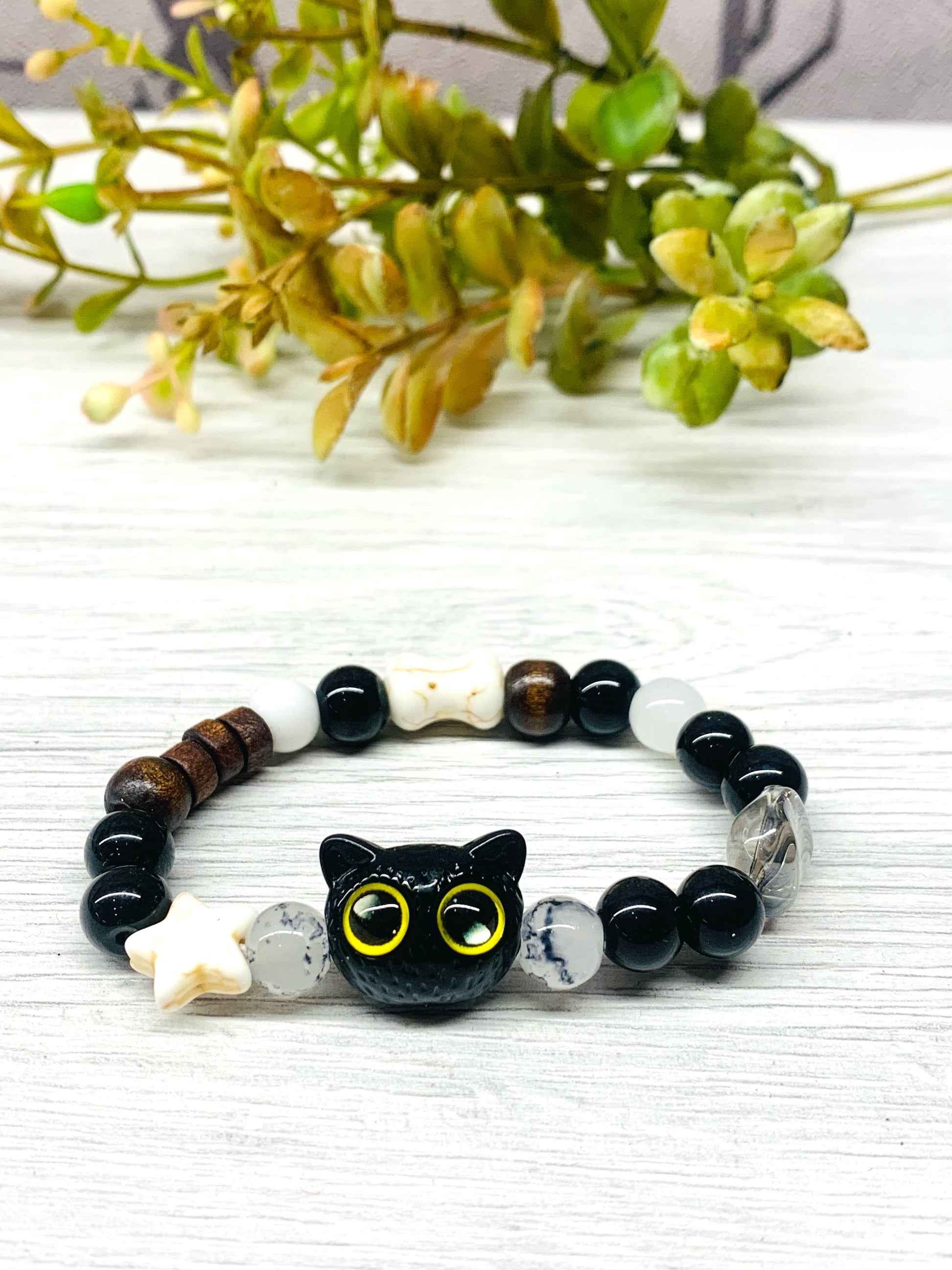 KITTEN elastic~ bracciale con gattino e perle in pietra dura naturale, elasticizzato