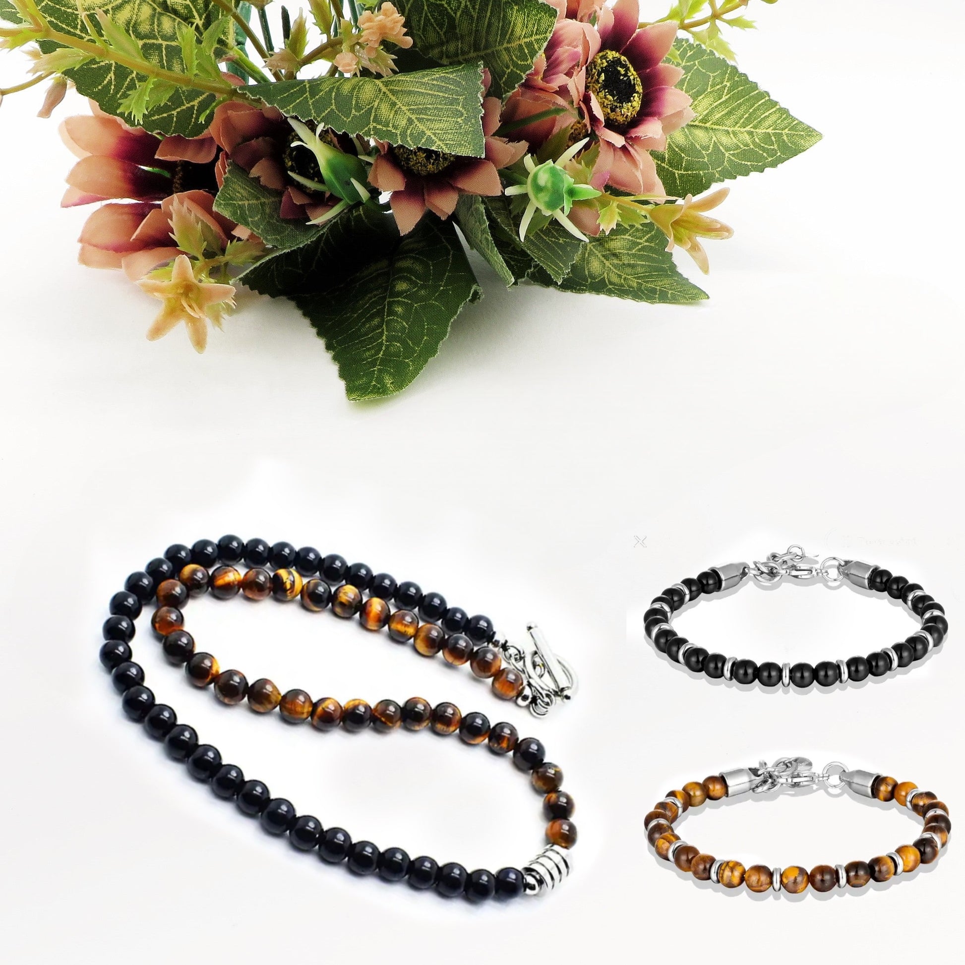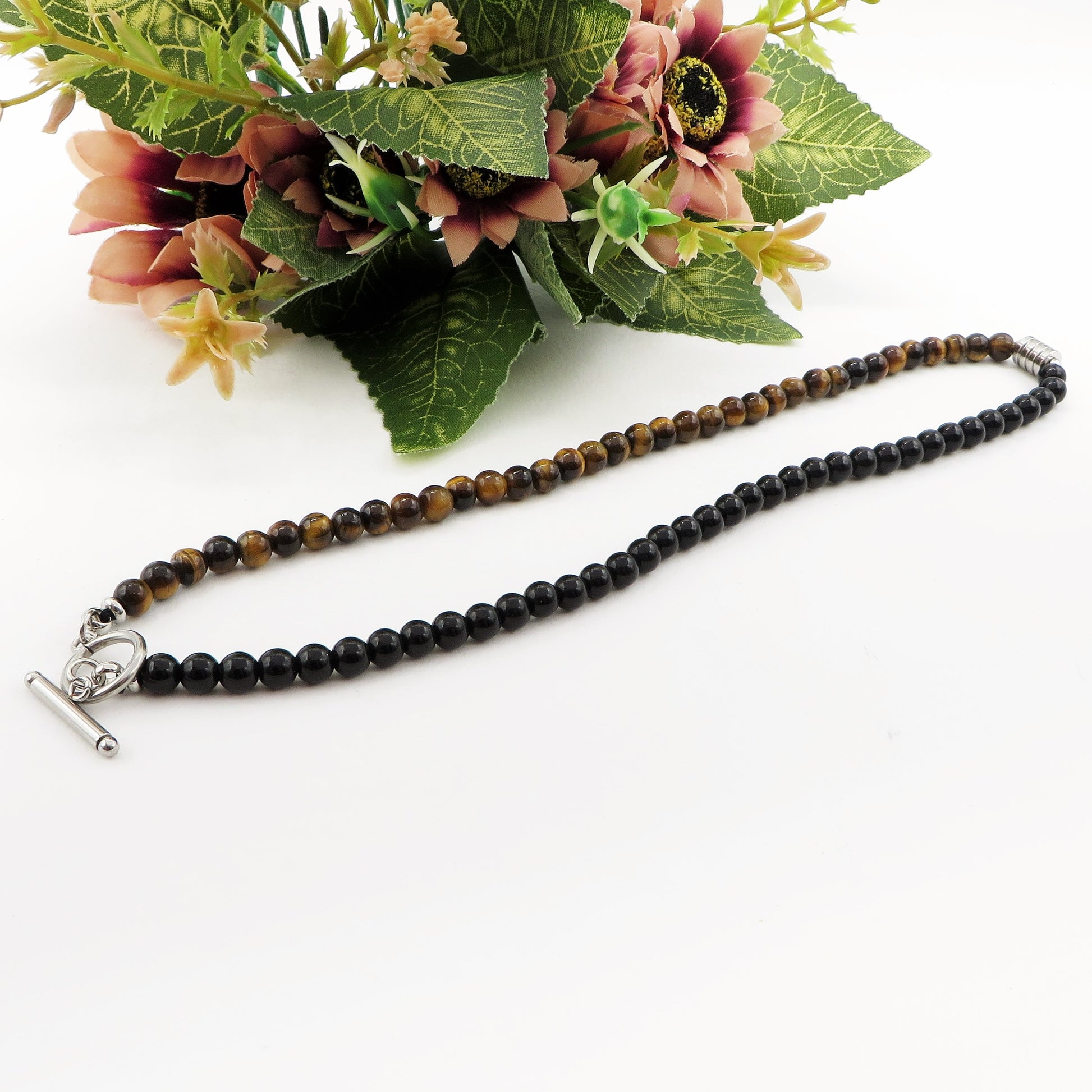 Kyŏnghŏ ~ Collana unisex bicolore in occhio di tigre e ossidiana + acciaio inossidabile