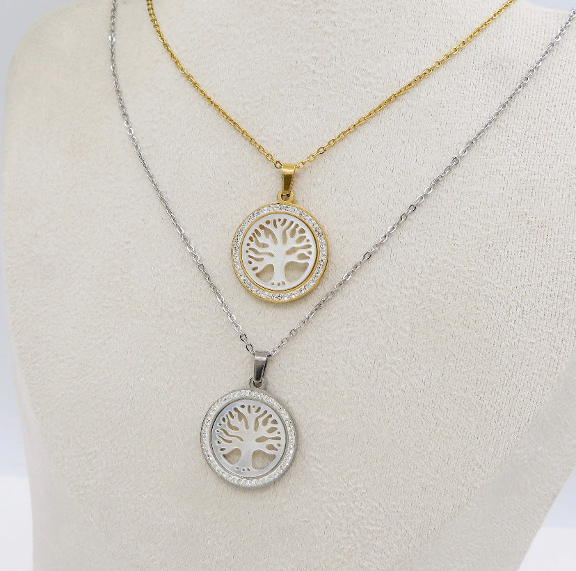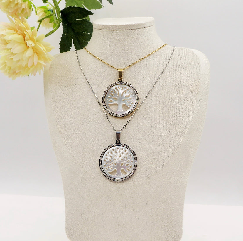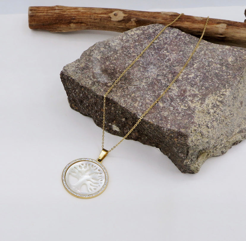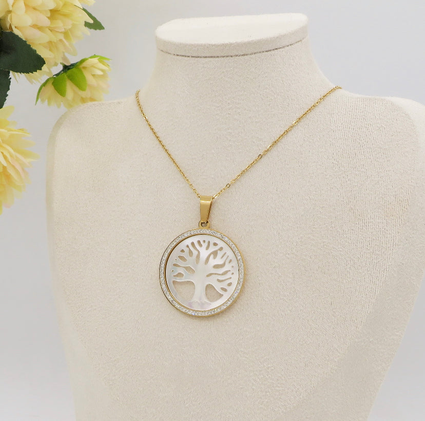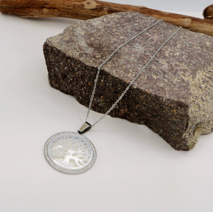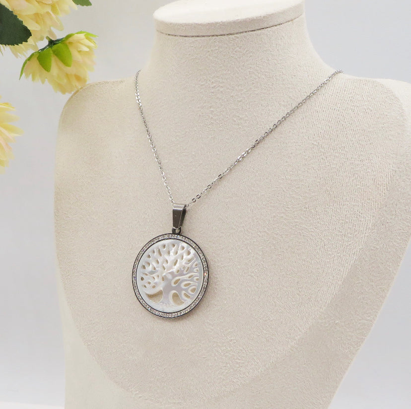 TREE OF LIFE MADREPERLA ~ ALBERO DELLA VITA COLLANA BIG in acciaio inossidabile ~ Ciondolo in madreperla e zirconi